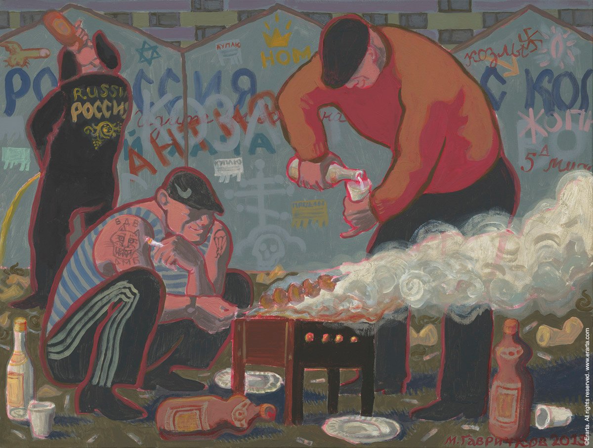 Я не уверен, но по-моему это вообще не похоже на блюдо высокой кухни. Откуда тогда этот нездоровый пиетет? Эти ритуальные танцы вокруг куска жареного мяса? Почему каждый мудак думает, что именно ему известен ИСТИННЫЙ рецепт приготовления этого яства, как будто он вычитал его на обрывке берестяной грамоты, найденной в гробнице древнерусского князя? Какие-то невероятные комбинации ингридиентов маринада, якобы придающие плоти убитого животного целительные и даже магические свойства. Фанатическое следование безумным и высосаным из пальца традициям, оставленные нам, видимо, не кем иным, как самим Иисусом Иосифовичем. "Настоящий шашлык должен быть только из баранины!", - кричит один. "Нет, настоящий только из ягненка!!", - сквозь зубы цедит другой, уже готовясь вцепиться в горло своему оппоненту. "Шашлык не терпит женских рук!", - невпопад шутит третий, хотя никаких женщин нет в радиусе нескольких километров. С наступлением теплого времени года всем непременно нужно срочно и обязательно именно "шашлычок на природке под музычку". Видимо, потому что очень легко реализовать. Или просто нет фантазии найти другое развлечение. Не успев насладиться свежим весенним ветерком каждая посадка, каждый куст задыхаются от "шашлычно-алкогольного" чада под ритмы тимати, марув и прочей параши. Над дачными кооперативами стоит дымовуха ничем не уступающая смогу над пром.зоной и победно завывают Лепс, Ваенга, и все почему-то "тишины хотят".